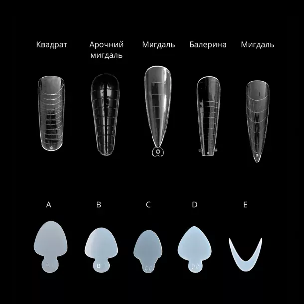 Якісний пластик форм та зручна розмітка дозволяють втілити будь-який варіант нарощування: від класичних мигдалеподібних та квадратних нігтів до екстравагантних стилетів.