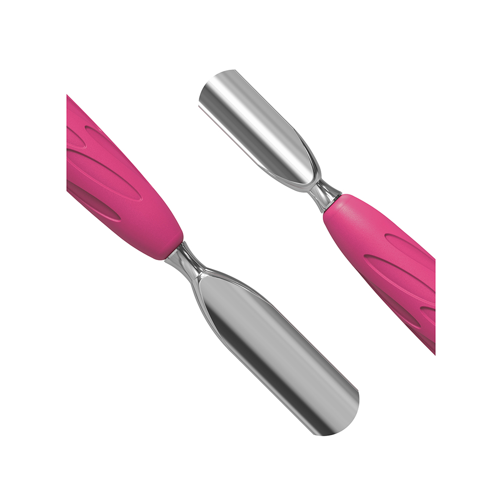 Ручка із силікону допомагає рівномірно розподілити тиск по поверхні пальця, запобігаючи пошкодженню шкіри та дискомфорту. Вона легше очищається та дезінфікується, що робить використання пушера в салонах краси максимально гігієнічним. Рожева насадка на ручці зручна для захоплення інструменту без ковзання, що дозволяє майстру працювати без напруги кисті руки.